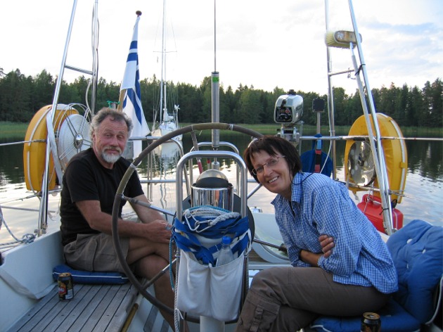 Päivä oli hyvää purjehdusta länsituulella ja illalla ankkuroiduimme 27 mailin jälkeen yhdessä Serenadan kanssa meille tuttuun Byön lahukkaan (Uudenmaan virkistysalueyhdistyksen Bockhamn-retkisatama). Voi sitä tapaamisen riemua! Yksi harmittava tapaus sattui juuri Byön salmen suulla: Serenada otti sisäänajoreitin hieman eri kohdasta kuin me (salmen suulla meitä idempää) ja jysäytti kivelle. Teräsvene ei siitä sen pahempaa tykännyt, mutta Jendrek ja Seija olivat mustelmilla ja kiveltä poispääsy vaati oman työnsä. Itse olemme ajaneet sisään ties kuinka usein, emmekä ole lainkaan olleet tietoisia tuosta kivestä. Heillä kaiku näytti koko ajan kivellä ollessakin ihan riittäviä lukemia, joten ilmeisesti kysymyksessä oli yksinäinen kivi, joka nousi korkealle.