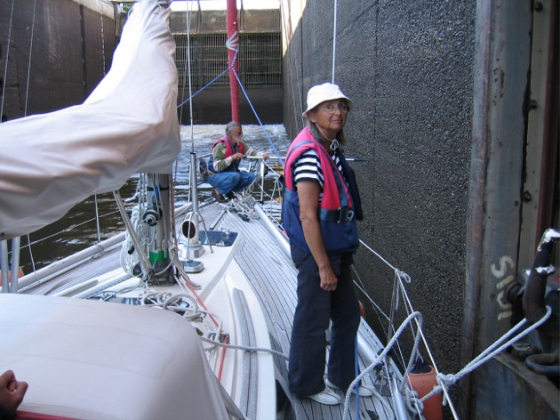 Maanantaiaamuna Ari ja Pehr irrottivat köydet jo ennen klo 7. Valitettavasti itätuuli jatkui ja ajelimme koneella. Vartiovenettä ei näkynyt, meitä ei käyty tunnistamassa, eikä tällä kertaa kutsuttu edes VHF:llä. Vysotskissa (Uuraisessa) ei tarvinnut pysähtyä ja alasululla Juustilassa (Bruschnitsnoessa) olimme 47 mailin jälkeen klo 14.30. Tässä täytettiin Venäjän tullikaavake ja jokin toinen kaavake, lisäksi luovutimme yhden miehistöluettelon ja venetodistuksen kopion. Jouduimme odottamaan sulutusta noin tunnin verran vilkkaan laivaliikenteen vuoksi. Merellä lämpötila oli ollut aamulla vain 14 astetta ja taivas pilvessä, mutta nyt aurinko paistoi ja lämpötila oli kohonnut jo 22 asteeseen.
