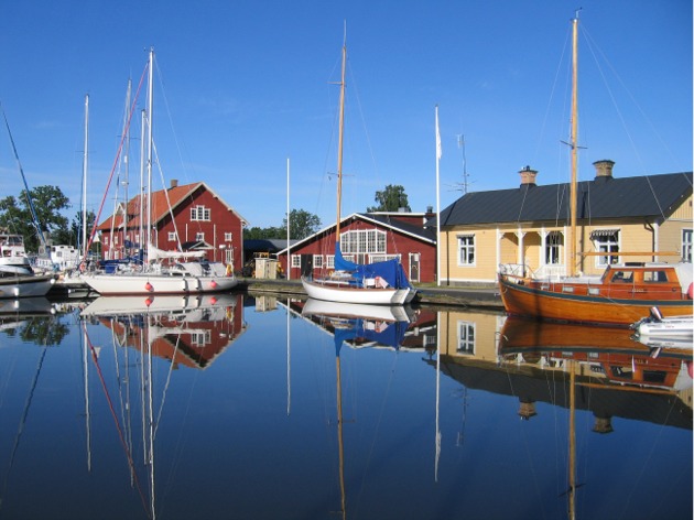 Sjötorpissa viivyimme vielä tiistain 24.6., sillä yöllä oli kova sade ja aamulla tuuli 13 m/s lounaasta. Sadekeliin ja kovaan vastatuuleen me emme yleensä viitsi lähteä. Päivän mittaan tuuli heikkeni ja sää selkeni. Keskiviikkoaamu valkeni aurinkoisena ja pitkästä aikaa tuntui aamu kesäiseltä. Oli aika jatkaa matkaa Vänernille. Olimme ns. yläsatamassa, joten ennen järvelle pääsyä oli vielä edessä Sjötorpin kolme sulkua. Edellispäivän tuulesta ei ollut mitään jäljellä, vaan järven pinta oli täysin tyyni, joten koneajoahan siitä tuli. Vänerniä emme aikoneet kierrellä ja katsella, vaan suunta oli suoraan ylitse kohti Vänersborgia. Iltapäivästä noin klo 16 tuuli virisi (vastatuuli) ja saman tien yltyi. Ilma viileni ja avotaivalta ajaessamme aallokko nousi järviolosuhteita ajatellen korkeaksi mutta lyhyeksi. Edessä oli märkää keliä. Nopeus oli välillä lähellä 6 solmua, mutta aalloissa nyökkiessä tippui välillä vain reiluun 3 solmuun. Mietimme jo, alammeko luovia, muutammeko kulkusuuntaa vai mitä teemme. Noin puolitoista tuntia kesti tätä keliä, kunnes tuuli vähän hellitti ja järven pinta tasoittui sen verran, että kulku alkoi olla jälleen miellyttävää. Sää oli muuttunut kuitenkin kylmäksi. Illalla saavuimme Vänersborgiin klo 21.30 ja lämpötila oli silloin 13 astetta. Koneajoa oli koko päivä ja matkaa tuli tälle päivälle noin 65 mailia. Edellisen Vänersborgissa käynnin jälkeen vierassatama oli muuttunut täysin, en tiedä, oliko se edes samalla paikalla, ainakaan se ei näyttänyt millään tavalla tutulta. Pesutilojen perusteella epäilen sataman olleen hyvin uuden.