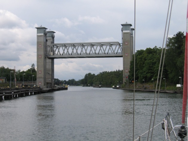 Trollhättanin kanavalla yksi silta nostettiin kyllin ylös.Päivän aikana matka eteni joutuisasti, sillä meillä oli jatkuvasti noin 2 solmun myötävirta. Loppumatkasta nopeutta hieman laski reipas vastatuuli, joka joellakin nosti sen verran aallokkoa, että jälleen kansi roiskui märäksi. Illalla klo 19 jälkeen saavuimme Göteborgin Lilla Bommenin vierassatamaan. Tähän asti olimme ihmetelleet liikkeellä olevien veneiden vähäistä määrää, mutta nyt tuntui ensimmäistä kertaa, että muutkin veneilevät ihmiset ovat lomansa aloittaneet, vaikka ei tämäkään satama vielä täysi ollut.
