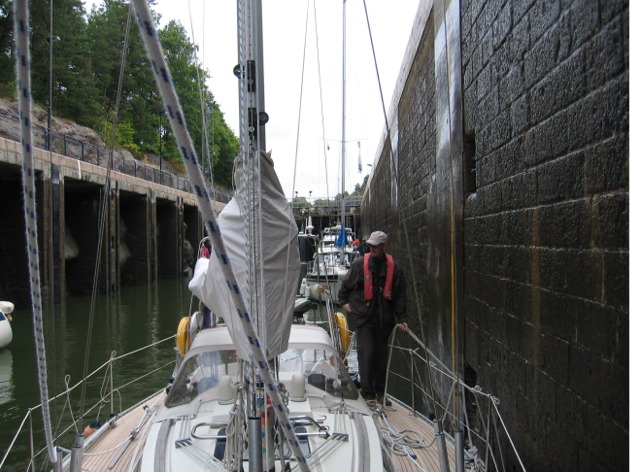 Torstaina 26.6. matka jatkui Vänersborgista Trollhättanin kanavaan (tai kuten joku sanoo Götajoelle). Kanavamaksu oli 775 kruunua eli reilut 80 euroa. Päivän mittaan sää vaihteli: aamulla 10 astetta, illalla 17 astetta, välillä paistoi aurinko, välillä hieman satoi, illalla tuuli oli reipasta (noin 12 m/s). Trollhättanin kanava on 82 km pitkä, mutta siinä on vain 6 sulkua, joissa pudotusta on yhteensä noin 44 metriä. Näistä 4 sulkua on Trollhättanissa, yksi sulku on jo lähellä Vänersborgia ja yksi 20 km Trollhättanista merelle päin. Näin viimeiset 45 km on pelkkää joki-osuutta ilman sulkuja. Siltoja on useita, joista osa on niin korkeita, että mahdumme alitse, osa avattiin heti siltaa lähestyttäessä ja joidenkin avausta jouduimme vähän odottelemaan. Sulut ovat erittäin helppoja. Niissä ei ole veden pinnan mukana liikkuvia pollareita kuten on Saimaan kanavassa, vaan niissä pidetään köydellä tai puoshaalla kiinni joko sulun kyljessä olevista tikkaista tai sitten korkeussuunnassa muutaman metrin välein olevista kiinteistä pollareista. Se, miksi nämä sulut ovat niin helppoja, johtuu siitä, että vesi poistuu pohjan kautta eikä sulussa ollessa huomaa minkäänlaisia pyörteitä eikä siis veneen paikallaan pitäminen vaadi voimaa. Edellisen kerran Trollhättanin kanavan menimme alas ilman merikorttia pelkällä turistioppaan kartalla. Ajattelimme, ettemme voi mitenkään eksyä kanavalla. Emmekä eksyneetkään, mutta aika oleellista kanavainfoa meiltä puuttui, mm. tieto siitä, että sulkujen itäreunat ovat huviveneille sopivampia, kun niissä on sileät seinämät (oheisesta kuvasta näkyy seinämien erilaisuus).