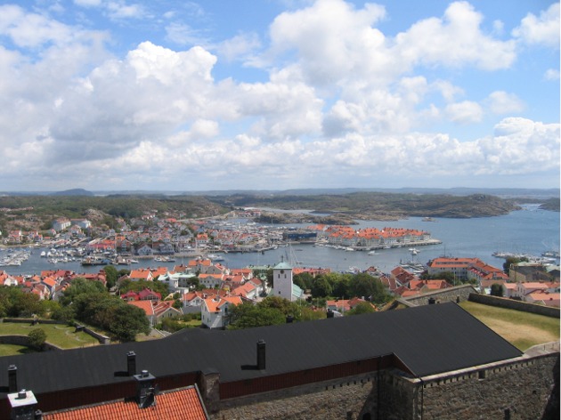 Ensimmäinen kohteemme oli 22 mailin päässä oleva Marstrand, joka on ainakin purjehtijoiden keskuudessa tunnettu paikka. Emme oikein tienneet, miksi se oli kuuluisa, mutta halusimme paikan kuitenkin nähdä. Yllätykseksemme perjantaina satama ei ollut alkuunkaan täysi (venepaikkoja on 230), mutta muuten kaupungilla kävi kuhinaa. Saari on selvästi suosittu lomapaikka, lisäksi siellä näkyi käyvän väkeä päivävierailulla (saaresta on salmen ylitse hyvin lyhyt lauttamatka). Veneilijöiden joukossa oli paljon lapsiperheitä eikä perjantai-iltana ollut minkäänlaista hulinameininkiä. Marstrand ei ole mikään iso kaupunki ja koko saaren ympäri kävelee noin tunnissa. Saarella kaikki toiminta keskittyy rantakadun ja parin muun kadun varrelle. Saaren korkeimmalla kohdalla on iso linnoitus, jolla on tänä vuonna 350 vuoden juhlavuosi.