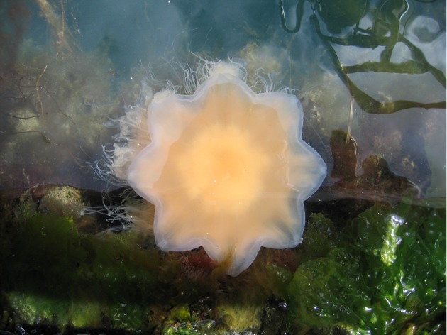 Maanantaille 30.6. oli luvassa kovaa tuulta ja aamupäivän aikana tuuli yltyikin. Me päätimme pitää jälleen satamapäivän. Ari kävi aamulla virvelillä tavoittelemassa Atlantin kaloja ja sai yhden pienen turskan, mutta päästi sen takaisin. Iltaan mennessä tuuli vinkui jo tosissaan (15 m/s ja puuskat päälle) ja rantakallioilla kävellessämme aaltojen kuohut ja pärskeet olivat melkoisia. Jännä havaita, miten Lysekilissä oli eri näköisiä meduusoja kuin oli ollut Marstrandissa: etelämpänä ne olivat vaaleita, mutta nyt oranssin ruskeita.