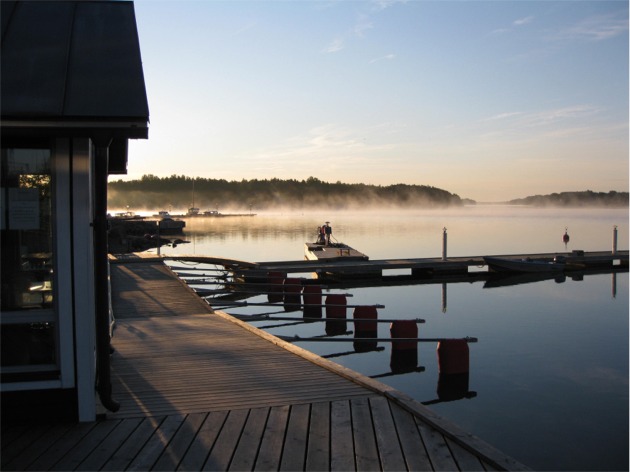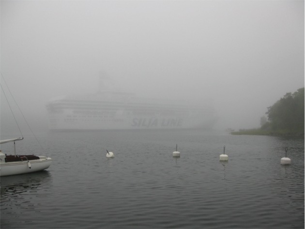 Keskiviikkona 10.6. suuntasimme Ahvenanmeren ylitse kohti Ruotsia. Aamu oli aiempia lämpimämpi, 10 astetta, mutta muuten päivä oli harmaan pilvinen ja sateinen. Kun päivän mittaan lämpötila pysyi aamun lukemissa, niin kylmältähän se tuntui. Säästä huolimatta nyt oli vuorossa hyvä purjehduspäivä. Itätuulta oli 6 m/s ja Ahvenanmeri ylittyi reippaalla vauhdilla, mutta samalla leppoisasti. Klo 14 Ruotsin aikaa (klo 15 Suomen aikaa) saavuimme Furusundiin 44 mailin päivätaipaleen jälkeen. Illalla nousi kova sumu, joka jatkui seuraavana aamunakin. Yöllä ohikulkevat laivat soittivat sumutorvia. Joskus kauan sitten olemme olleet Furusundissa yötä ja siitä oli jäänyt mieleen se, miten ohikulkevien laivojen aallot keinuttivat venettä. Nyt keinutus oli hyvin vähäistä; liekö laivojen muodot kehittyneet tai nopeudet alentuneet vai vaikuttiko asiaan Jonin suurempi paino Sunwindiin verrattuna.