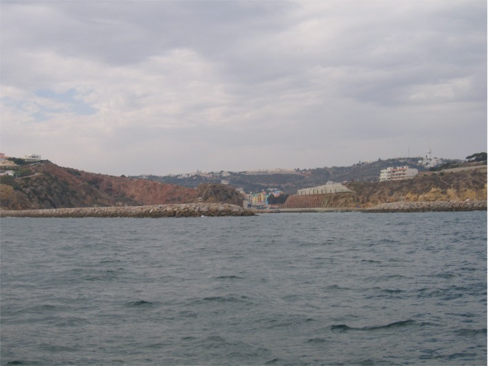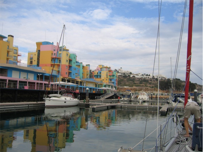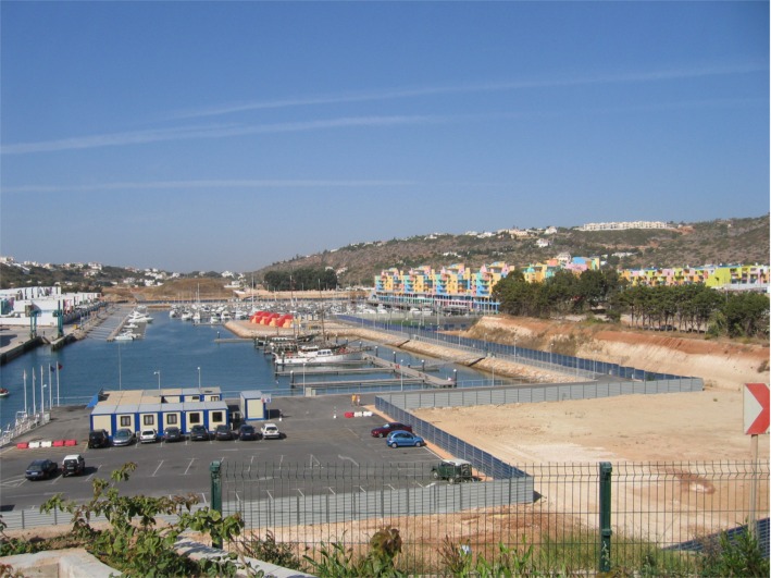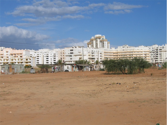 Aivan Vilamouran itäpuolella hotellien vieressä asuttiin etualalla näkyvissä vaatimattomissa "hökkeleissä", alueesta osa oli jo purettu. |