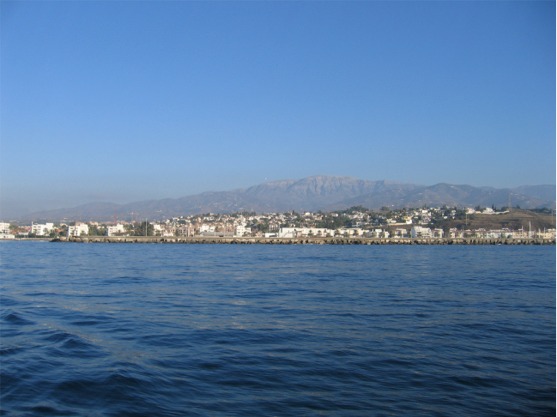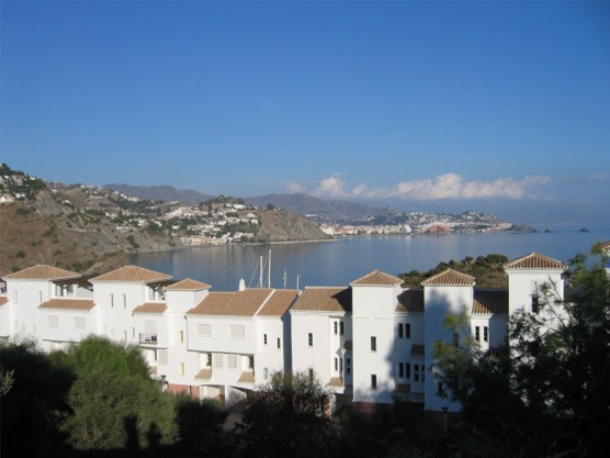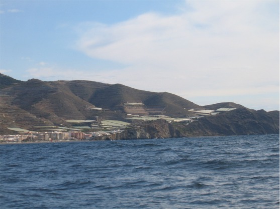 Velezin jälkeen rannoille alkoi ilmaantua kasvihuoneita (nuo vaaleat läiskät vuorten rinteillä). |