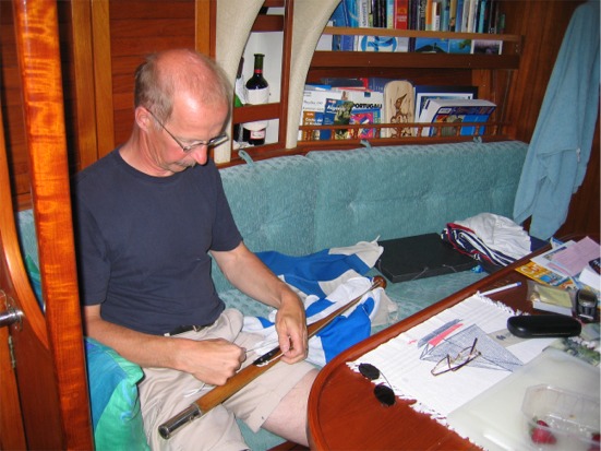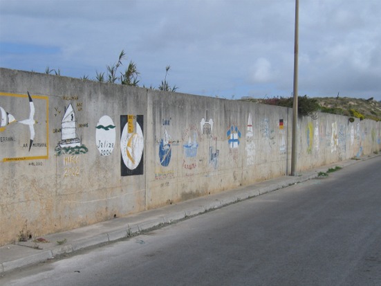 Satama-alueen aallonmurtajaan ovat monet veneilijät maalanneet (ihan luvalla) logojansa. Me emme maalanneet.