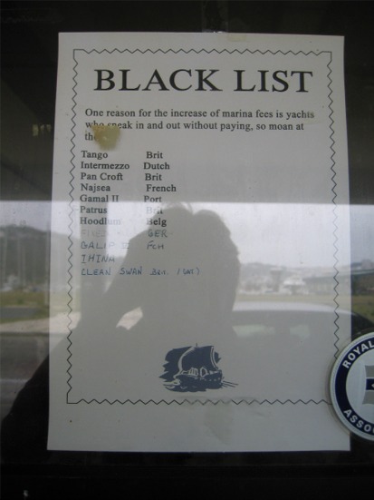 Satamakonttorin ikkunassa musta lista satamamaksunsa laistaneista veneistä.