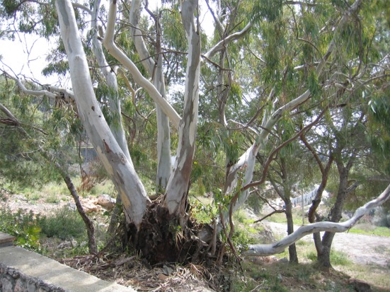 Eukalyptuspuiden kuoriutuneita runkoja.