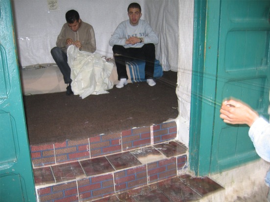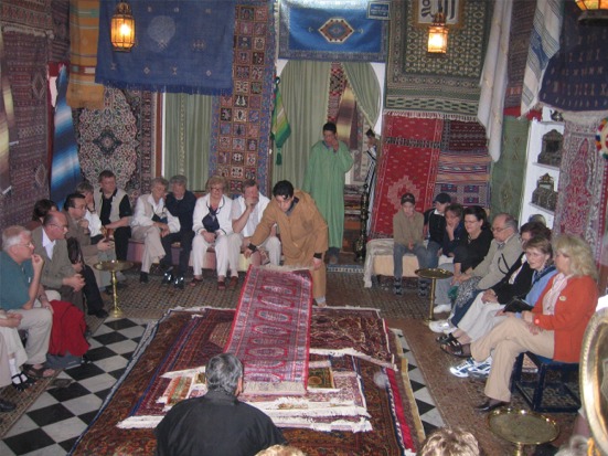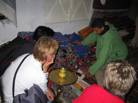 Valtaosa meni oppaamme (äärimmäisenä oikealla) kanssa isompaan huoneeseen. Esiteltäviä mattoja oli aika pino keskellä lattiaa.