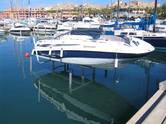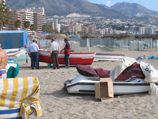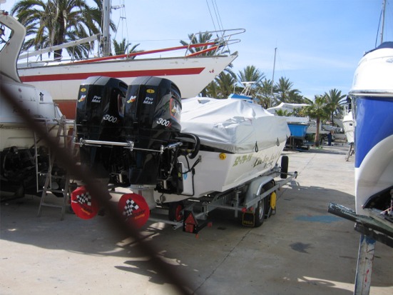 Fuengirolan telakka-alueella. Veneessä pituutta noin 6-7 metriä ja 600 hevosvoimaa! Nouseekohan vene ilmaan!
