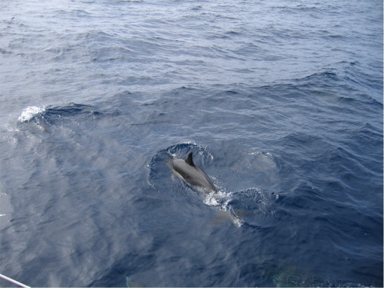 Meille uusia luonnon ihmeitä ihastelimme jälleen. Alkumatkasta veden pinnalla näkyi pieniä pyöreitä meduusoja, erilaisia kuin Itämerellä nähdyt ja portugalin sotalaivoiksi nimitettyjä noin viiden senttimetrin pituisia sinisiä eliöitä, joilla on aivan kuin purje selässä ja jotka kuulema polttavat, jos osuvat iholle. Ensimmäisenä iltana ja sen jälkeen useammankin kerran delfiinit tulivat hyppimään ympärillämme ja ne seurasivat venettä pitkän tovin. Perjantai- ja lauantaiaamuna näimme useamman kerran kauempana nousevan ykskaks vesisuihkun korkealle ylöspäin; emme keksineet muuta selitystä kuin, että siellä oli valaita.
