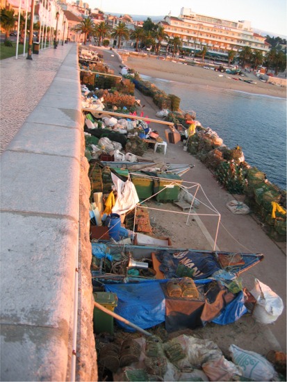 Kalastustarvikkeiden varastointia CascaisissaNäiden huuhtelupuuhien jälkeen selvitimme turisti-infosta Sintran kaupunkiin menevät bussit ja hyppäsimme bussiin. Matkareitti kierteli kaikki mahdolliset pienet kylät ja samalla kävi myös Capo da Rocalla. Toinen bussireitti olisi mennyt suorempaan, mutta tällä bussilla pääsimme samalla halvalle (2,75 €/henkilö/suunta) yli tunnin maaseutukierrokselle ja koimme todella upeat näköalat. Sintran kaupunki on maailman perintölistalla ja viehättävä tutustumiskohde se onkin. Nyt tosin vähän häiritsi se, että oli lauantai ja siellä oli uskomattoman paljon turisteja. Muutenkin olimme ykskaks siirtyneet turistialueelle; Pohjois-Portugalissa koimme olevamme keskellä paikallista väestöä, Povoa de Varzimissakin oli vain muutama vierasvene. Nyt Cascaisissa katujen varsilla ravintoloiden ruokalistat olivat englanniksi ja tuntui, että kaduilla kuuli jatkuvasti englantia. Samoin joka paikassa (kaupoissa, marinassa, ...) tunnuttiin osattavan hyvin englantia. Cascaisissa onkin upeat hiekkarannat ja tietysti hotelleja paljon.