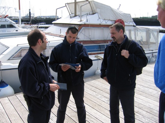 Tullin miehet tarkistamassa papereitamme.Perjantain päivämatka oli vain 25 mailia, mutta sillä siirryimmekin Belgian puolelle Oostendeen. Päivästä piti tulla helteinen, mutta lämpötila jäi 19 asteeseen ja ennusteista poikkeava pohjoistuuli viilensi lisää. Iltapäivästä Oostendessä ollessamme satoi reippaasti, jopa rakeita ja ukkonenkin jyrähteli.