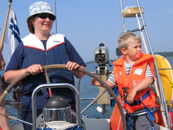 Tuijan ja Samuelin vuoro hoidella ruoriaSunnuntaina heräilimme kaikessa rauhassa, nautimme lämpimästä aamusta ja aamupalan jälkeen starttasimme matkaan kohti suosikkipaikkaamme Gullkronaa. Olimme sopineet kohtaavamme siellä tuttumme Kukkoset. Saavuimme perille klo 16 ja päivämatka oli 26 mailia. Gullkronan savukala maistui hyvältä ja illalla jälleen saunoimme (olin soittanut jo päivällä ja varannut saunan, jota muuten saavuttuamme tuskin olisi enää saanut samalle illalle).