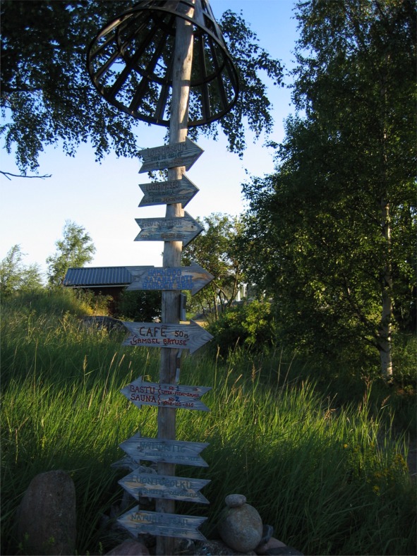 Gullkronan opasviitatkin ovat nähtävyysTiistaina jatkoimme matkaa. Kauniit säät jatkuivat edelleen; kyllä on ollut uskomaton kesä: aurinkoa, poutaa ja hyviä purjehdustuulia! Nytkin purjehduskeli oli hyvä, mitä nyt tuuli vähän kieputteli suuntaansa. Högsåran itäpuolta luovimme mukavassa tuulessa; luoviminenkin on leppoisaa, kun ei ole aallokkoa. Sitten purjehdimme Hiittisten pohjoispuolella myötätuuleen (länsi-lounaistuulella) virsikirjalla, kunnes ykskaks totesimme, että virsikirjalla ei enää pääse, purimme sen ja lähes heti saimme kiristellä purjeita oikein kunnolla. Kulkusuuntamme muuttui samalla sen verran, että Hangon selällä nousimme niin tiukkaan vastaiseen kuin suinkin pääsimme. Tuuli olikin nyt kaakosta. Ei ollut ensimmäinen kerta, kun Hangon läntisellä selällä ja sen jälkeen Hiittisten pohjoispuolella on tuuli aivan eri suunnasta. Klo 15 olimme Hangossa Itämerenportissa, jonne luovimisineen tuli matkaa 39 mailia.