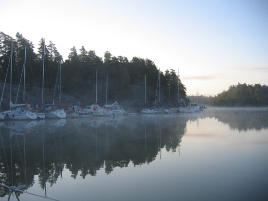 Elisaari aamulla klo 6Iltakävelyllä näimme kaksi kaurista ja torstaiaamuna Ari näki pari lisää. Aamulla ei ollut tietoakaan edellispäivän tuulesta, vaan Elisaaren rauhaisaa lahtea verhosi pienet sumulautat ja meri oli peilityyni. Liikkeelle lähdimme jo klo 6. Minun ei ollut tarkoitus nousta lainkaan, mutta nähtyäni, miten kaunis aamu oli, en heti malttanutkaan ummistaa silmiäni. Katselin maisemia puolisen tuntia, mutta sitten menin nukkumaan ja nukuin makoisasti klo 9 asti. Herätessäni kuulin ihanaa aaltojen loisketta veneen keulassa. Tuuli oli virinnyt mukavasti ja ylösnoustuani olimme juuri ylittäneet Porkkalanselän. Koko päivän etenimme melko kevyessä lounaistuulessa purjeilla, kunnes Helsingin kaakkoispuolella tuuli heikkeni ja viimeisen puolitoista tuntia ajoimme koneella Sipoon Karhusaareen. Perillä olimme klo 16.40 ja matkaa oli takana 50 mailia.