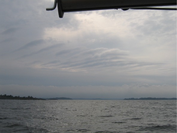 Matkan aikana voi vaikka ihmetellä, miten monenlaisia pilviä on.Torstain 5.7. vietimme Västervikissä, jolloin välillä oli sadetta, välillä taas auringonpaistetta. Tuuli oli puuskaista ja vaihteli 6-13 m/s, mutta suunta oli koko ajan pohjoisesta.