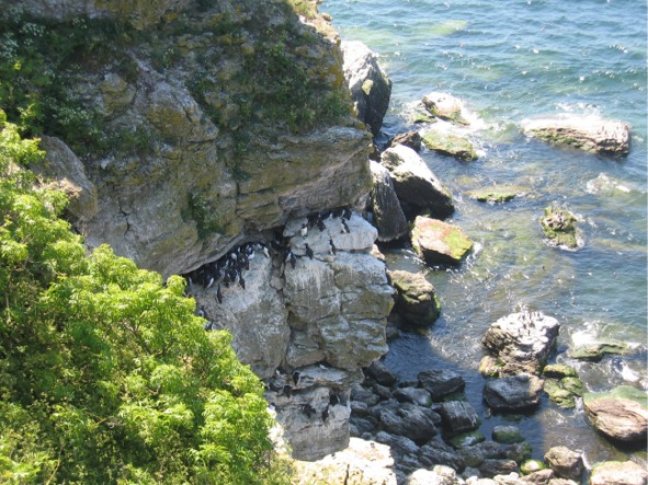 Kuvassa vain pieni osa valtavasta lintuparvesta (musta-valkoiset täplät kallion kielekkeellä).Keskiviikko 13.6. alkoi hammaslääkärin etsinnällä, sillä Arilta oli irronnut edellisenä päivänä paikka. Kun nyt olisi ollut matkan jatkamisen kannalta vastatuulta, päätimme jatkaa Visbyssä oleilua ja hoitaa hammas kuntoon. Turisti-infosta Ari sai puhelinnumeron, johon soittamalla saatiinkin aika heti samalle päivälle klo 11.10. Tulihan siinä aamupäivän kävely, kun marssimme noin 3 km matkan edestakaisin. Hammas tuli kuntoon.