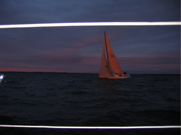 Auringon laskun aikaan tuli useita jossakin kilpailussa mukana olevia veneitä vastaan (valkoiset poikkiviivat ovat oman veneemme kaidevaijereita).Nyt lauantaina olemme vain lähinnä oleilleet ja lueskelleet, niin ja täällä on hyvä sauna! Huomiseksi sunnuntaiksi on luvattu tuulen kääntyvän lounaiseksi, siis meille vastatuuleksi ja voimakkuudeltaan 8-12 m/s, jopa 16 m/s. Ei ole mitään hinkua lähteä luovimaan etelään päin, joten oletettavasti olemme täällä Kalmarissa huomisenkin päivän.