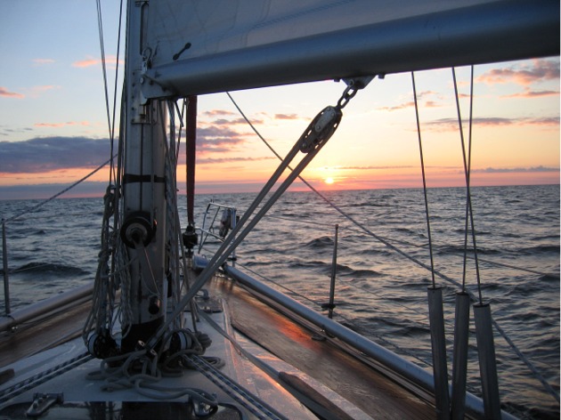 Meille sopiva vahtisysteemi on se, että minun vuoroni ovat klo 21-24 ja klo 03-06, Arilla klo 00-03 ja klo 06-09 (tai usein niin pitkään kuin minä aamulla nukun). Vuoden reissullamme minun molemmat vuoroni olivat pimeän aikaan, mutta nyt Itämerellä näen puolestaan sekä auringonlaskun että -nousun. Lisäksi jo Etelä-Itämeren ja Tukholman saariston välillä on selvästi havaittava ero pimeän ajan pituudessa. Etelä-Itämerellä en nähnyt lukea, ulkona enää kovin kauan klo 21 jälkeen, mutta nyt tämän yön aikana näin lukea huomattavasti kauemmin. Ari sanoi, ettei varsinaista pimeää tällä kertaa ollutkaan. Ensimmäisen vahtivuoroni lopulla tuuli jälleen heikkeni ja Arin vahtivuoro meni koneella ajellen. Klo 03 vahdin vaihtuessa saimme nostettua uudelleen ison purjeen ja vauhtia oli 4-5,5 solmua. Tuuli voimistui (ja aallokko kasvoi) niin, että klo 06 Arin tullessa vahtiin teimme reivin. Yö oli muun liikenteen kannalta hiljainen: minä näin klo 03-06 vuorollani vain yhden purjeveneen, en yhtäkään laivaa. Aution meren ja todella kostean (ei satanut, vaan oli puolikirkasta) yön takia istuinkin suuren osan vuorostani sisällä ja luin. Huomasin kuitenkin, että kun tavallisesti olen tottunut vahtivuorollani istua kököttämään ulkona tai kulkuaukossa, niin nytkin säntäilin varmaankin 5 minuutin välein kurkkaamaan ulos, näkyykö mitään.