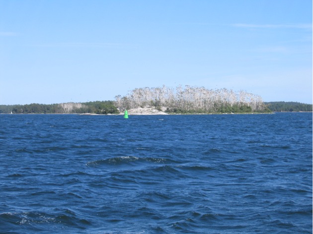 Harmaa saari on merimetsojen valtakuntaa Dalarön lähellä - harmaus johtuu kuolleista puista. Merimetsot näyttävät lisääntyvän vuosi vuodelta.Maanantaiaamuna klo 05 (Ruotsin aikaa, klo 06 Suomen aikaa) aurinko paistoi, kun sivuutimme Nyhamnin eli olimme Ahvenanmaalla, siis Suomessa. Koneajo jatkui edelleen Arin vahtivuorolla klo 06 jälkeen ja herätessäni oli Ahvenanmaan saaristo lähes ohitse. Olimme täysin tyynellä Kihdillä. Pian tuuli virisi ja etenimme ihan mukavasti heikohkossa tuulessa. Jälleen totesimme, miten heikollakin tuulella vene kulkee ihan kelvollista vauhtia, kun ei ole isoa aallokkoa.