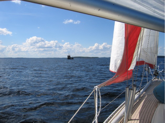 Sunnuntaiaamuna klo 10.30 saavutimme Landsortin, jolloin minä heräsin ja totesin tuulen edelleen yltyneen ja aallokon kasvaneen. Koko päivän jatkui reipas tuuli (8-10 m/s) ja etenimme Tukholman saariston läpi hyvää vauhtia. Sääennusteet kuulostivat sellaiselta, että päätimme jatkaa saman tien toisenkin yön. Kun tuuli jatkui reippaana edelleen illalla, emme viitsineet lähteä Sandhamnin kohdalta avomerelle keikkumaan, vaan valitsimme pienen kierron (alle 20 mailia) ja lyhyemmän avomeriosuuden Ahvenanmeren ylitse perinteistä Kapellskär-Nyhamn -reittiä pitkin. Ennen puolta yötä tuuli heikkeni nopeasti ja saapuessamme Kapellskärin laivaväylälle ja Arin tullessa vahtivuoroon oli jälleen vuorossa koneajo, kuten muinakin öinä tähän aikaan. Minä painuin nukkumaan ja Ari jäi seikkailemaan laivojen sekaan; niitä oli kuulema tullut vastaan ja mennyt ohitse lukuisia. Yhden laivan aaltoihin minäkin heräsin. Klo 03 minun vahtivuoroni alkaessa myös etelä-pohjoissuuntainen laivaväylä oli sivuutettu ja minulle tuli helppo vahtivuoro.