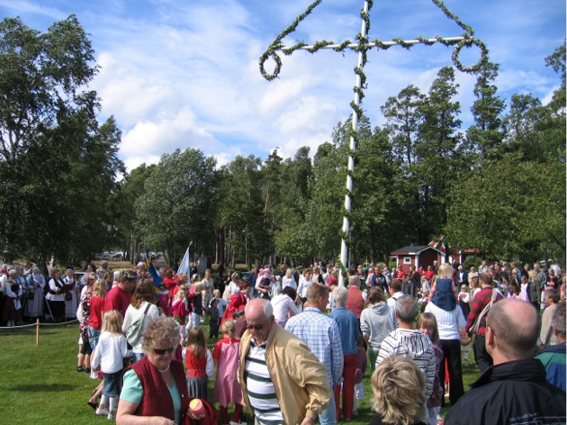 Juhannusaaton vietto alkoi aivan vierassataman tuntumassa jo klo 15 haitarin soitolla ja kulkueella pienen matkan päähän juhannussalon luokse. Useina juhannuksina olemme seuranneet juhannussalon koristelua ja se on kestänyt tunnin jos ei kaksikin, mutta tällä kertaa salon koristeista (koivun oksista) oli tehty valmis pitkä nauha, joka nyt vain kiedottiin salon ympärille ja sitten salko nostettiin pystyyn. Kun me ehdimme paikalle reilun puolen tunnin kuluttua, niin olimme myöhässä ja salko oli jo pystyssä. Paikalla oli vielä arvan myyntiä ja salon ympärillä piiritansseja. Juhannusaaton lämpötila oli noin 17 astetta ja välillä tuli reippaita sadekuuroja, välillä paistoi aurinko.