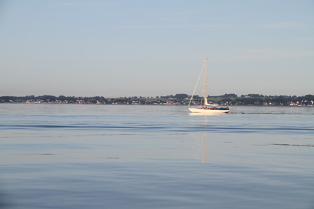 Maanantai 28.6. valkeni aurinkoisena ja vähätuulisena. Ari starttasi liikkeelle jo klo 6.10, minä jatkoin tapani mukaan uniani. Suunta oli kohti Bornholmia, joka on Tanskan saari Simrishamnista kaakkoon. Välillä tuuli virisi sen verran, että pääsimme etenemään purjein, mutta sitten heikkeni jälleen. Simrishamnista Bornholmiin mennessä ylitetään vilkkaat laivaväylät; Ari laski parhaimmillaan nähneensä yhtä aikaa 11 laivaa. Klo 12.30 saavuimme Gudhjemin satamaan (Bornholmin itäpuolella) ja matkaa oli takana 36 mailia lokin mukaan, GPS:n mukaan vain 30 mailia. Ero ei johdu lokimme väärästä näytöstä, vaan siitä, että välillä meillä oli jopa 0,8 solmun vastavirta. Perillä totesimme, että nyt oli ensimmäinen todellinen hellepäivä ja kummasti etsimme auringon suojaa veneen sisältä.