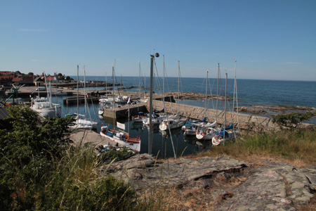 Gudhjemin sisäänajo. Kuvattu aamulla pois lähtiessämme. Kovalla kelillä sisään tullessa on tarpeen tietää, mihin tulee, sillä sisääntulo on ahdas kovalla kelillä.Kalmarsundiin päästyämme meri tasoittui ja illan mittaan tuulikin alkoi hiipua. Viimeiset pari tuntia ajoimmekin koneella. Kalmaria lähestyessämme aurinko laski ja pimeä alkoi tulla. Pohdimmekin, että olemme tainneet etelästä päin saapua Kalmariin useammin pimeässä kuin valoisassa. Klo 23.20 olimme kiinnittyneet laituriin (ja ottaneet taas poijuhaan käyttöön) ja taivalta oli takana melko tarkasti 100 mailia. Lippua laskiessani huomasin vähän nolon jutun: emme olleet muistaneet vaihtaa Tanskan kohteliaisuuslippua Ruotsin lippuun, toivottavasti kukaan ei ollut ehtinyt sitä huomata.