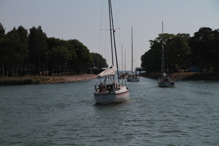Keskiviikkona 21.7. oli edessä pitkä päivä läpi Venäjän aluevesien ja Saimaan kanavan. Virallisesti Venäjän vesillä saa liikkua vain klo 8-20 Moskovan aikaa eli klo 7-21 Suomen aikaa ja niinpä lähdimme Santiosta klo 6.30 Suomen aikaa. Edellisenä iltana olimme tehneet puhelimitse ilmoituksen Inflotiin saapumisestamme rajalle tai itse asiassa Maisan väki oli ilmoittanut meidät molemmat (ohjeet Saimaan kanavan kautta kulkemiseen löytyvät netistä googlettamalla, tässä suora osoite http://portal.fma.fi/sivu/www/fma_fi/merenkulun_palvelut/vaylat_kanavat/kanavat/saimaankanava ja sieltä Veneliikenneohjeet). Tällä kertaa oli mukavasti tuulta niin, että pääsimme etenemään purjein koko matkan Vysotskin (Uuraisen) aallonmurtajalle asti, minä jälkeen ei enää saakaan purjehtia. Vysotskiin oli matkaa 29 mailia ja olimme siellä puolen päivän aikaan. Tämän jälkeen oli kahden ja puolen tunnin (noin 15 mailia) koneajomatka Viipurin ohitse alimmalle sululle, jossa on Venäjän tullitarkastus. Usein tämä tarkastus on viime vuosina tarkoittanut pelkästään tulliselvityskaavakkeen jättämistä/täyttämistä sekä miehistöluettelon ja venetodistuksen kopion antamista, mutta tällä kertaa piti näyttää kaikkien passit ja alkuperäinen venetodistus. Moniin vuosiin ei ole enää kukaan Venäjän viranomainen käynyt veneessä sisällä.
