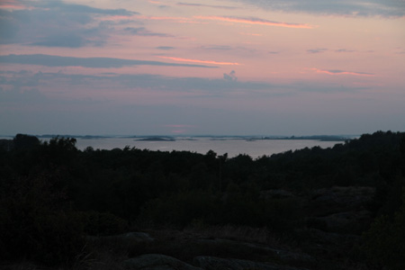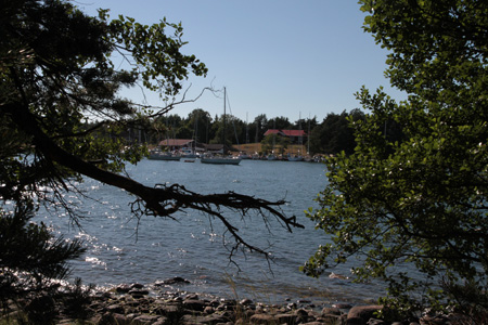 Aiemmin Kökarissa olemme olleet Sandvikissa ja Karlbyssä, mutta nyt tuli tutustuttua tähän kolmanteen Kökarin satamaan. Korkean mäen huipulla on ravintola, josta on hyvät näkymät ympäriinsä. Satama-altaassa on kiinnittymiseen joitakin poijuja, paaluja (tolppia) ja osa veneistä oli ankkurin varassa. Laiturissa oli myös toinen Jon 33, ruotsalainen s/y Verona. Hellesää (28-29 asetta) jatkui edelleen ja vesi oli todella lämmintä, eikä sinilevää näkynyt. Lämpimän päivän houkuttelemana Ari vuokrasi skootterin ja ajeli sekä Karlbyhyn että Sandvikiin. Vielä illallakin oli 27 astetta. Kuulimme radiosta, että näin pitkää näin lämmintä säätä ei ole ollut 70 vuoteen. Edellisinä päivinä oli Puumalassa tehty kesän lämpöennätyksiä ja nyt oli Hämeenlinnassa lämpimintä (34,2 astetta).