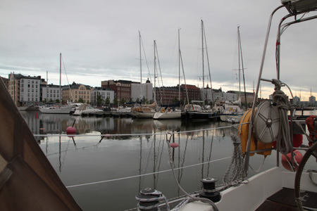 Seuraavana päivänä suuntamme oli Helsinkiin. Klo 6 lähtiessä oli jo 18 astetta lämmintä. Tuuli oli kaakkoa eli Porkkalanselällä vastaista, mutta sen jälkeen saimme jälleen hyvän purjehduspäivän. Pohdimme, mihin satamaan Helsingissä menisimme: Katajanokalta olisi helppo kulkea kaupungille, mutta viime vuonna siellä oli koko reissun kallein satamamaksu, minkä vuoksi aioimme boikotoida sitä, Pohjoisrannassa Moottorivenekerhon satama ei oikein innostanut, Sirpalesaari ja Liuskasaari taas ovat kaupungilla kulkemisen kannalta vähän hankalia. Päätimme soittaa Katajanokalle ja kysyä, onko heillä edelleen sataman pitäjän vaihduttuakin Itämeren kallein satamamaksu. Saimme kuulla, että hinta on 30 euroa ja se sisältää paitsi sähkön ja saunan, niin myös pesukoneiden vapaan käytön ja vielä rantakahvilassa kahvin/teen kahvileivän kera. Tämän jälkeen oli helppo tehdä päätös. Katajanokan vierassatamassa olimme klo 13 ja päivän taival oli 40 mailia.