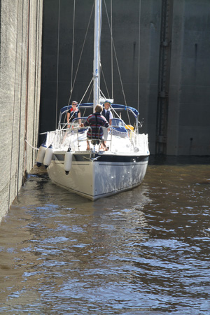 Klo 18.45 matka jatkui kohti Lappeenrantaa. Suomen puolella on kolme sulkua ja ennen viimeistä sulkua totesimme, miten nopeasti olemme päässeet etenemään, mutta iloitsimme liian aikaisin. Kuten yleensä joka vuosi, niin nytkin jouduimme päästämään ohitsemme matkustaja-alus Carelian. Sulkuvahti ehti jo kertoa meille, että pääsemme sulkuun heti, kun sulku on tyhjä (eli siis laskettu ala-asentoon), mutta sitten hän peruikin sen ja jouduimme odottamaan Carelian tulon ja sulutuksen ylös. Odotusta tuli noin 45 minuuttia (meillä yksi sulutus kesti noin 20 minuuttia, Carelia nousi ehkä vähän nopeammin). Klo 22.10 olimme sitten Mälkiän sulun yläpuolella ja noin klo 22.50 Lappeenrannan vierassatamassa 71 mailin päivätaipaleen jälkeen. Illan tullen olimme etsineet jo kevyttä pitkähihaista päällemme. Muuten muuten tällä kertaa kanavassa ei paleltu eikä satanut, kuten monesti on tehnyt, päinvastoin oli aika kuumaa, 28 astetta.