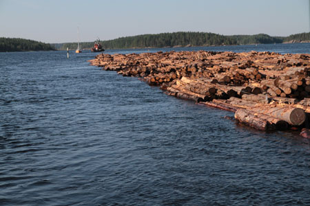 Torstaina oli edessä 38 mailin matka pursiseuramme majalle Korkeaan. Olimme liikkeellä klo 6.45, jolloin oli 22 astetta lämmintä (päivällä sitten 30 astetta). Vähän lähdön jälkeen Ari nosti purjeet. Aluksi livuttiin vain 2-3 solmua, mutta vähitellen tuuli voimistui ja loppumatkasta oli melkoisen puuskaista. Alkumatkasta tuli vastaan tukkilautta, joka meinasi aiheuttaa aika kiperän tilanteen. Ari oli kutsunut hinaajaa VHF:n kanavalla 16 kysyäkseen, kummalle puolelle tukkilauttaa kannattaisi mennä, mutta ei ollut saanut vastausta. Kun sitten on jommallakummalla puolella lauttaa, niin eipä sieltä enää mihinkään pääse. Olimme tukkilautan ja viittojen välissä ja siinä ei ollut paljoa tilaa. No nippanappa mahduimme sivuuttamaan lautan. Myöhemmin selvisi, että hinaajat käyttävät VHF-kanavaa 9.