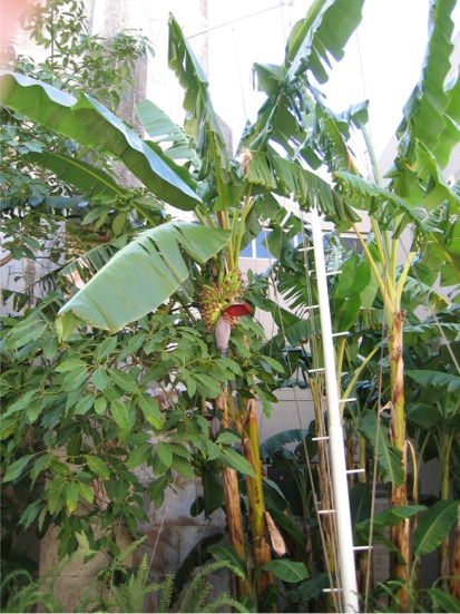 Luostarin puutarhassa banaani, lila/punainen on kukka ja sen yläpuolella on tertussa banaaneja. |