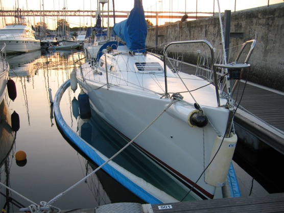 Lissabonissa Alcantaran marinassa eräs veneilijä oli keksinyt nerokkaan keinon estääkseen pohjan limettymistä: Veneen ympärille/alitse oli asetettu allas, jossa vene kellui vesijohtovedessä. |