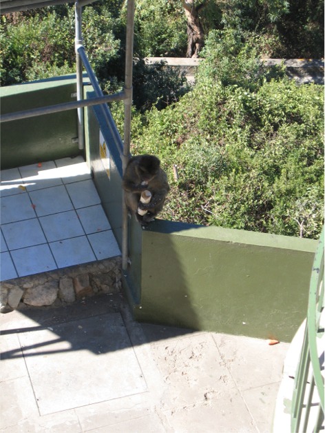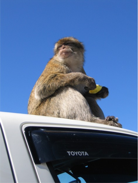 Kun auto pysähtyi, niin apinat olivat heti katolla, peileissä ja jopa pyrkimässä sisälle. Kovasti varoiteltiin koskemasta niihin ja että ne voivat purra. |