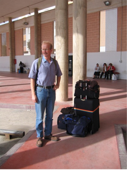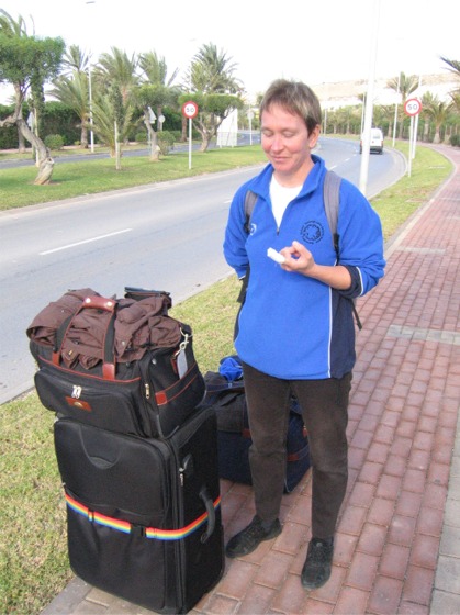 Suomeen lähdössä, bussin odotus Almerimarissa, sormi paketissa, vaatetus ylimitoitettu, lämpötila olikin 19 astetta. |