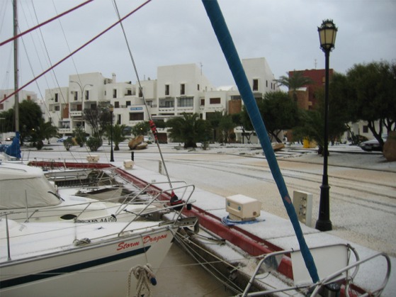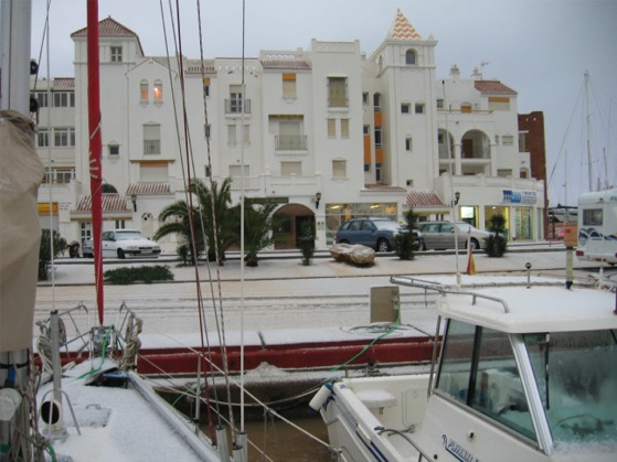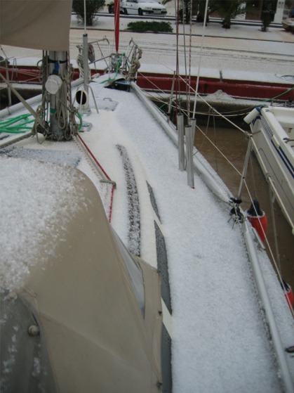 Maanantaina 7.2. heräsimme rakeiden ropinaan veneen kannelle ja näkymät olivat tällaisia.