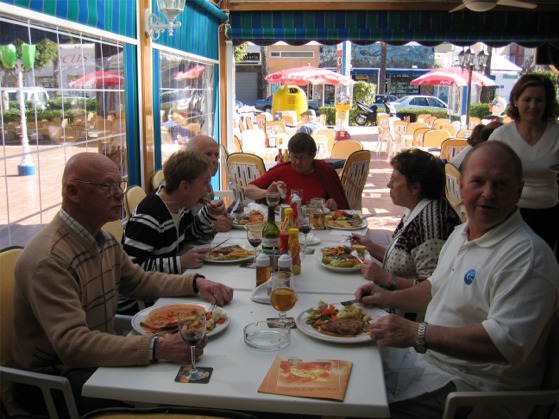 Kyläilimme Ollin ja Helenan luona ja kävimme lounaalla. Vasemmalta Tuomo, minä, Olli, Marjatta, Helena ja Martti.