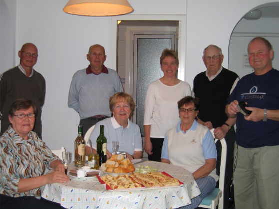 Eilan ja Eskon luona ystävänpäivän nyyttäreillä ja samalla Marjatan ja Martin läksiäisillä. Vasemmalta takana Tuomo, Olli, minä, Esko ja Martti. Istumassa vasemmalta Marjatta, Eila ja Helena.