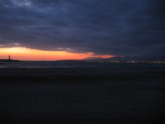 Auringonlasku, lahden vastakkaisen puolen valot vain näkyvät nauhana.