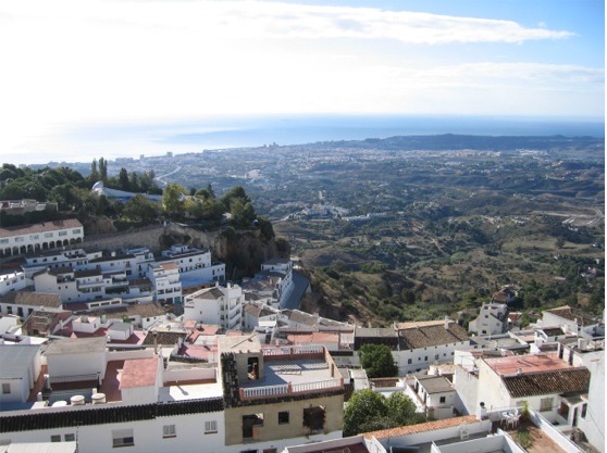 Tänään sunnuntaina on taas parin hieman viileämmän, tuulisemman ja epävakaisemman päivän jälkeen lämmintä ja kaunista. Kävimme (shortseissa) pyöräilemässä parin kymmenen kilometrin lenkin. Matka ei ollut pitkä, mutta siihen sisältyi nousuja. Ensin pyöräilimme 50 metrin nousun Los Pacosiin, joka on suomalaiskylä; kadun nimi on Avenida de Finlandia, siellä on suomalaisia liikkeitä ja kadulla kuulimme puhuttavan enemmän suomea kuin espanjaa. Sen jälkeen nousimme 400 metrin korkeudelle läheiseen Mijaksen vuoristokaupunkiin, jossa olimme jo autoillenkin käyneet. Siinä tulikin jo paita litimäräksi. Alaspäin huristeltiin vauhdikkaasti.