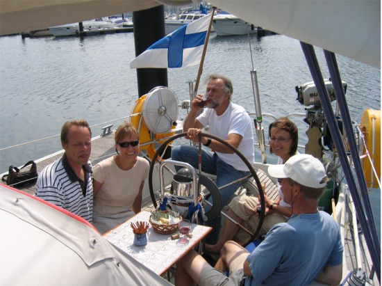 Hyvä esimerkki kaiken toiminnan verkkaisuudesta oli se, kun toissapäivänä olin tekemässä meille lounaaksi salaattia ja ihan extempore kutsuin myös Necessen väen pienelle välipalalle. Vähän myöhemmin Serenadan väki souteli ohitse ja hekin liittyivät seuraamme. Siinä sitä istuskellessa ja jutustellessa vierähtikin noin kuusi tuntia. Illalla menimme vielä yhdessä syömään merenantimia. Näin sille päivälle aiotut muut hommat jäivätkin tekemättä, jolloin saatoimme vaan todeta, että ehditäänhän ne tehdä huomennakin ja Serenadan väki totesi, etteivät he vielä seuraavanakaan päivänä taida ehtiä lähteä jatkamaan matkaa. Totesimme yhdessä, miten hienoja hetkiä tuollaiset ovat; tuskin meillä "tavallisessa" elämässä olisi ykskaks etukäteen sopimatta ollut aikaa viettää koko iltapäivää ja iltaa yhdessä. Vaan mukavaa oli.