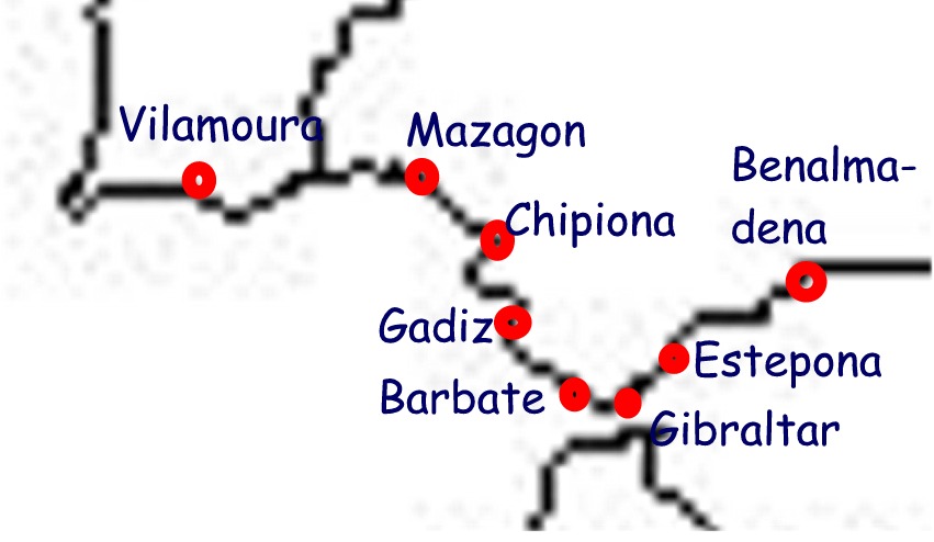 Päivään sisältyi ainakin kolme mieleenpainuvaa tapahtumaa. Delfiinit tulivat jälleen muutaman päivän tauon jälkeen vierellemme ja nyt ne olivat aiempaa isompia. Osalla oli poikaset mukanaan. Jotkut niistä hyppivät tosi komeasti ja paras hyppy lie ollut ainakin 3 metrin korkeuteen. Iltapäivästä aloin katsella, mitä tummaa häämöttää etuoikealla kaukaisuudessa. Lopulta tajusin, että siellä näkyy Afrikka. Silloin tuli uskomaton tunne, että me siis todella olemme omalla purjeveneellä Afrikan lähellä. Totesimme, että pitkä matka on tultu ja aikaa kulunut siitä hetkestä noin 20 vuoden takaa, kun lähdimme Saimaalla Suvisussu I:llä Himalansaaren laiturista ensimmäiselle viikon purjehduslomallemme. Vielä ennen satamaan pääsyämme sivuutimme historiallisen Trafalgarin niemen, missä Englannin laivasto amiraali Nelsonin johdolla vuonna 1805 kävi kuuluisan taistelunsa ranskalais-espanjalaista laivastoa vastaan. Näissä tunnelmissa saavuimme Barbateen, joka on viimeinen marina Atlantin puolella ennen Gibraltarin salmea. Päivän matka oli noin 39 mailia.