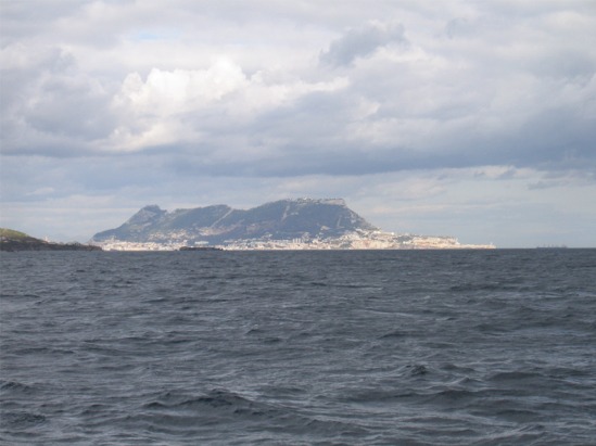 Nyt tuulet olivat suotuisia eli lännen puolelta ja päädyimme lähtemään siten, että alkumatkasta on vielä vastavirtaa, mutta ennen kapeinta kohtaa virta ehtii kääntyä myötäiseksi. Mukavasti tämä suunnitelma onnistuikin. Vastavirtaa kesti ehkä puolitoista tuntia ja silloin nopeutemme oli vain 2-3 solmua, mutta sitten myötävirralla saavutimme yli 8 solmun nopeuden. Sivuutimme koko matkamme ja samalla Manner-Euroopan eteläisimmän pisteen Tarifan niemen kohdalla. Afrikan puolelta näkyi todella korkeita vuoria ja lopulta Gibraltarinkin jylhä vuori ilmestyi näkyville.