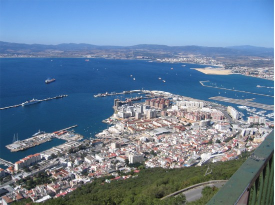 Gibraltarin Rockilta (yli 400 m korkea) näkymä kaupunkiin. Vastapäätä on Espanja ja oikealla meren päällä osa kiitorataa.Täällä kaivettiin taas punnat esille ja sitten taas Espanjan puolella käydessä eurot niin, että nyt on ollut koko ajan mukana sekä puntia että euroja. Tosin kyllä täällä eurotkin kelpaavat, mutta esimerkiksi venetarvikeliikkeessä he sanoivat suoraan antavansa eurolle vähän virallista kurssia heikomman hinnan. Nyt onkin pidettävä aina mielessä kummasta valuutasta on kysymys; onhan 1 punta noin 1,5 euroa. Välillä meinaa unohtua tuo suhde ja ajattelemme jonkin tuotteen olevan halvan ennen kuin jälleen muistamme kertoa sen 1,5:llä. Monet tuotteet tosin ovat täällä puntina saman mitä olemme Espanjassa ja Portugalissa tottuneet maksamaan euroina eli kallista on (kuten oli Englannissakin). Tuo elektroniikkapuoli on kuitenkin täällä naapurimaita halvempaa. Satamamaksu ei ole lähelläkään Englannin hintoja; siellä ne olivat oli 15-20 puntaa, nyt täällä alle 8 puntaa, vaikka lokakuu lasketaan täällä vielä kesäajaksi. Vesi ja sähkö laskutetaan erikseen kulutuksen mukaan. Gadizissa olimmekin yhden englantilaisveneen miesten kanssa juttusilla ja he kertoivat, että heille on paljon halvempaa pitää venettä Espanjassa ja lentää välillä sinne purjehtimaan kuin pitää venettä Englannissa. Siellä etelärannikolla vuosimaksu marinapaikasta olisi heille noin 1500 puntaa, siihen nostot ja laskut ja talvipaikat päälle, huh huh. Suomen hinnat (ainakin Saimaalla) ovat jotakin ihan muuta.