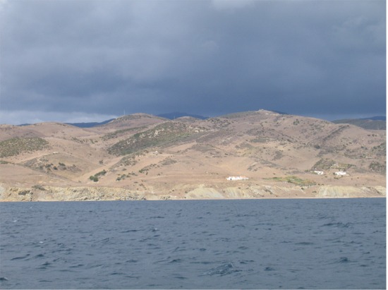 Seuraavana aamuna torstaina 14.10. starttasimme heti klo 8 jälkeen, jolloin oli vielä vähän aikaa pimeää. Tuuli oli heikohko ja matkamme eteni vuorotellen purjehtien ja sitten taas välillä koneella. Tuulen suunta on ollut jo pitkään lännen-pohjoisen puolelta eli meille usein täysmyötäistä. Luonnonsatamia täällä ei juurikaan ole ja marinoitakin sen verran harvassa, että täytyy valmiiksi miettiä mihin marinaan illaksi aikoo ehtiä. Kun emme halua uuteen satamaan mennä pimeällä, joudumme aina pitkin päivää tarkkailemaan nopeuttamme ja heikolla tuulella emme malta lipua purjein, vaan ajamme koneella. Tosin mainingissa heikolla tuulella purjehtiminen olisikin lähinnä purjeiden läiskyttelyä. Päivän aikana alkuiltapäivästä tuuli jälleen yltyi 10-12 m/s. Nyt olimme niin matalassa vedessä (alle 20 m), että aallokko oli melkoisen lyhyttä ja keikuttelevaa. Kun tuuli oli vielä aivan takaa, ajaminen oli aika tarkkaa puuhaa.
