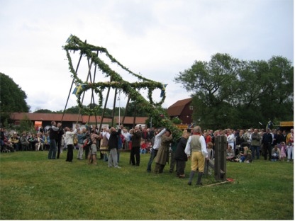 | Näinä päivinä täällä on ollut aamuisin kaunista auringonpaistetta, jopa shortsikeliä eli lähes 20 astetta, mutta päivän mittaan pilvisyys on lisääntynyt ja sateitakin on tullut. Täällä Ruotsissa juhannuksena ei kokkoja polteta, vaan pystytetään juhannussalko, mikä tapahtuu jo iltapäivällä. Niinpä tänään kävelimmekin noin 3 kilometrin päähän, jossa ensin juhannussalko koristeltiin koivun ja pensaiden oksilla ja kukilla, minkä jälkeen se nostettiin pystyyn ja sitten väki tanssi salon ympärillä. Aiempina kesinä olemme pari kertaa olleet juhannuksena Tanskassa eräässä eteläisessä saaressa, missä ihan oikeana juhannuspäivänä eli 24.6. poltetaan illalla kokko. Saksassa ollessamme juhannuksesta ei ole ollut tietoakaan; siellä aatto on aivan tavallinen työpäivä ja juhannuspäivä normaali lauantai. |